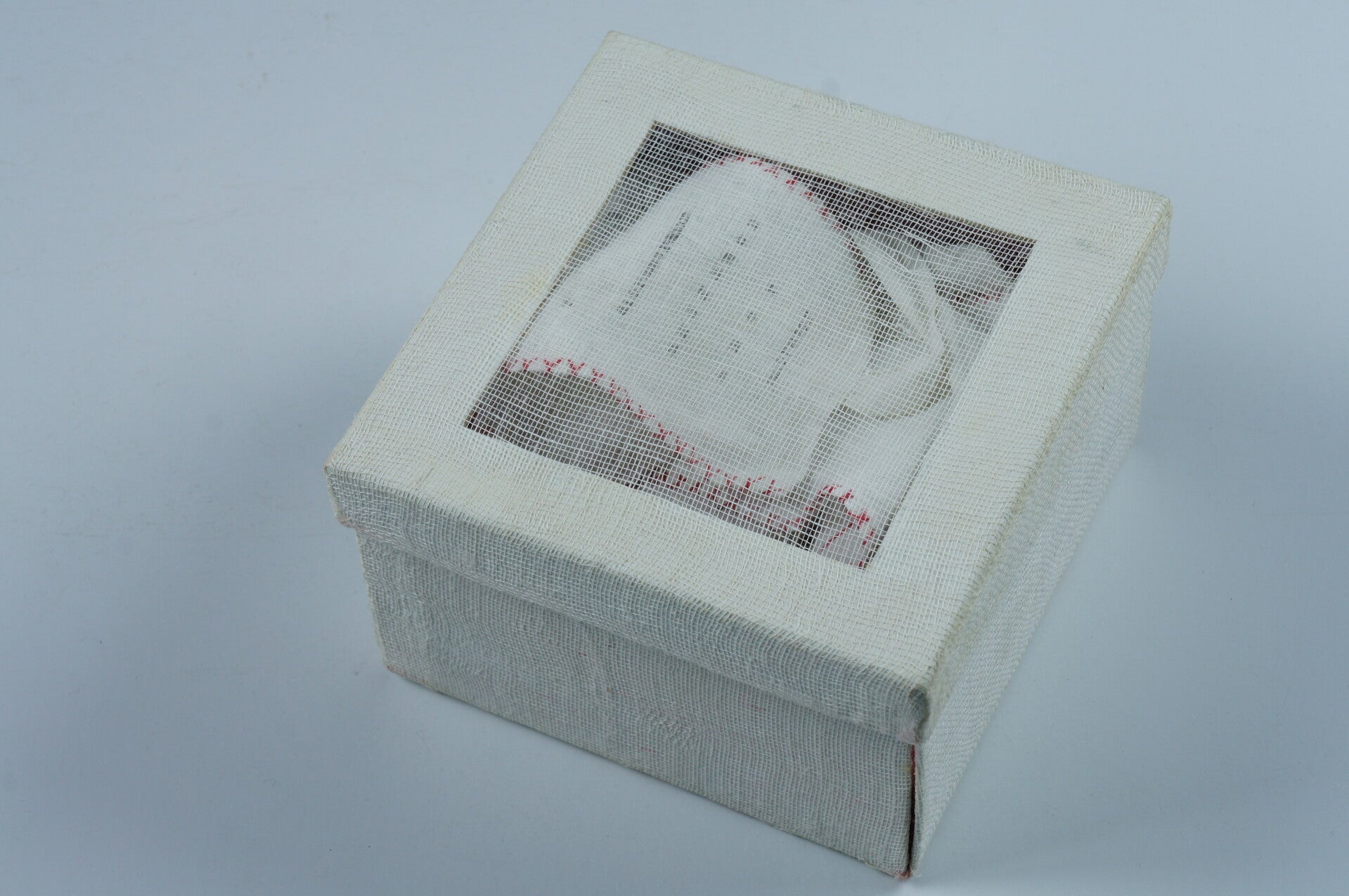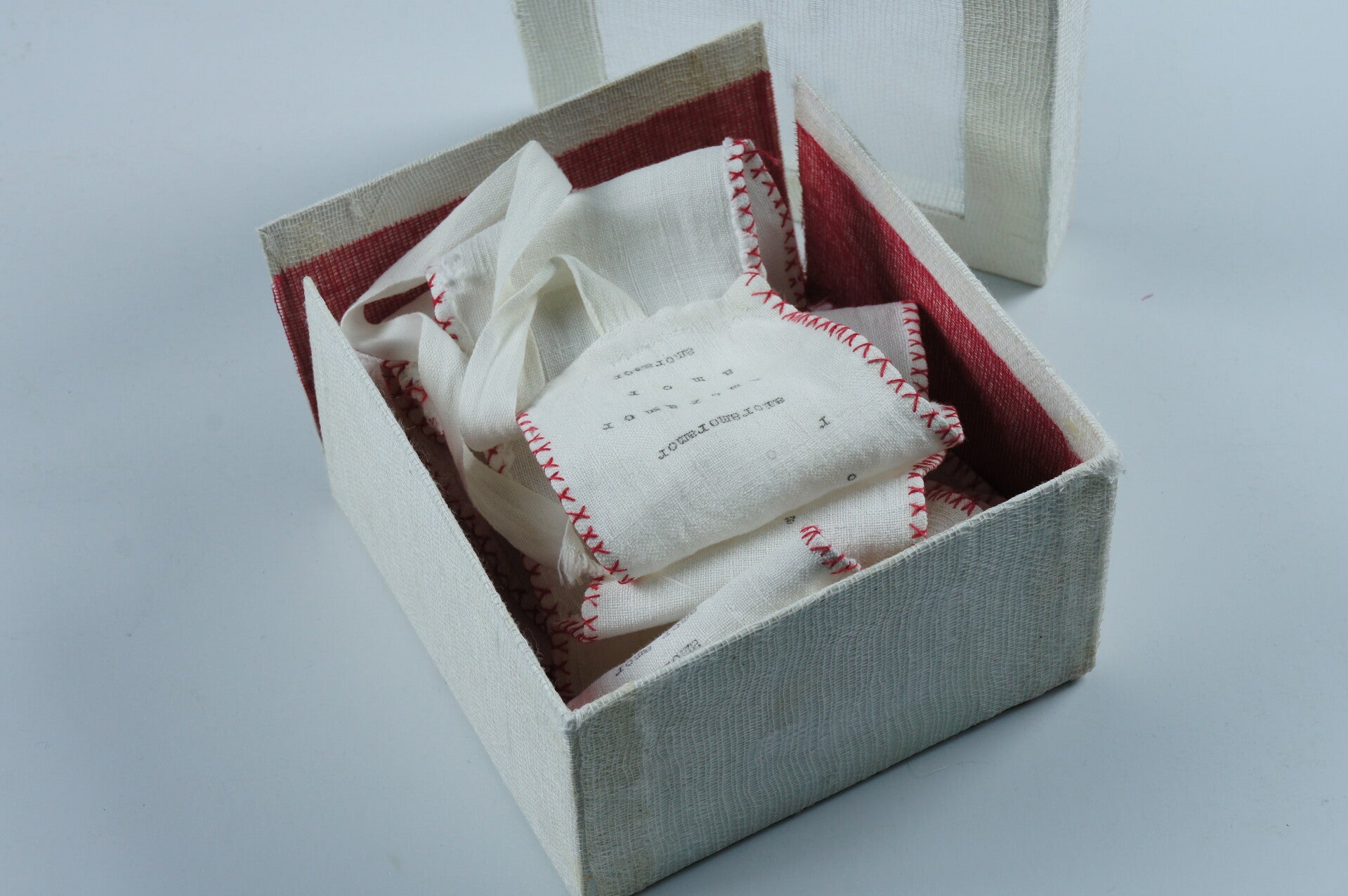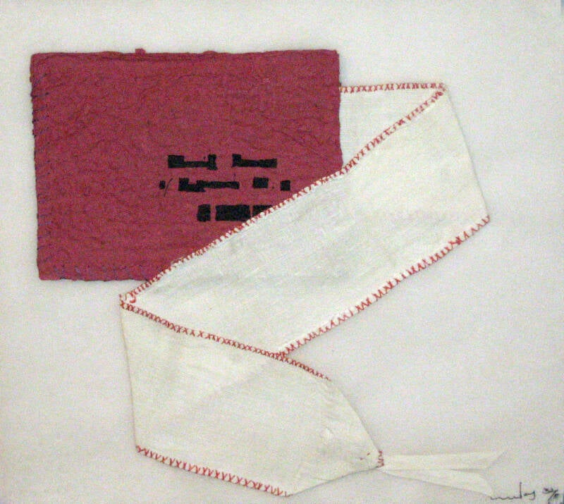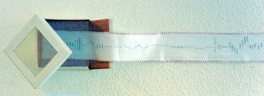 Libro de artista o escultura que contiene un largo poema visual escrito a máquina sobre una venda antigua hecha a mano de 3 metros de largo.