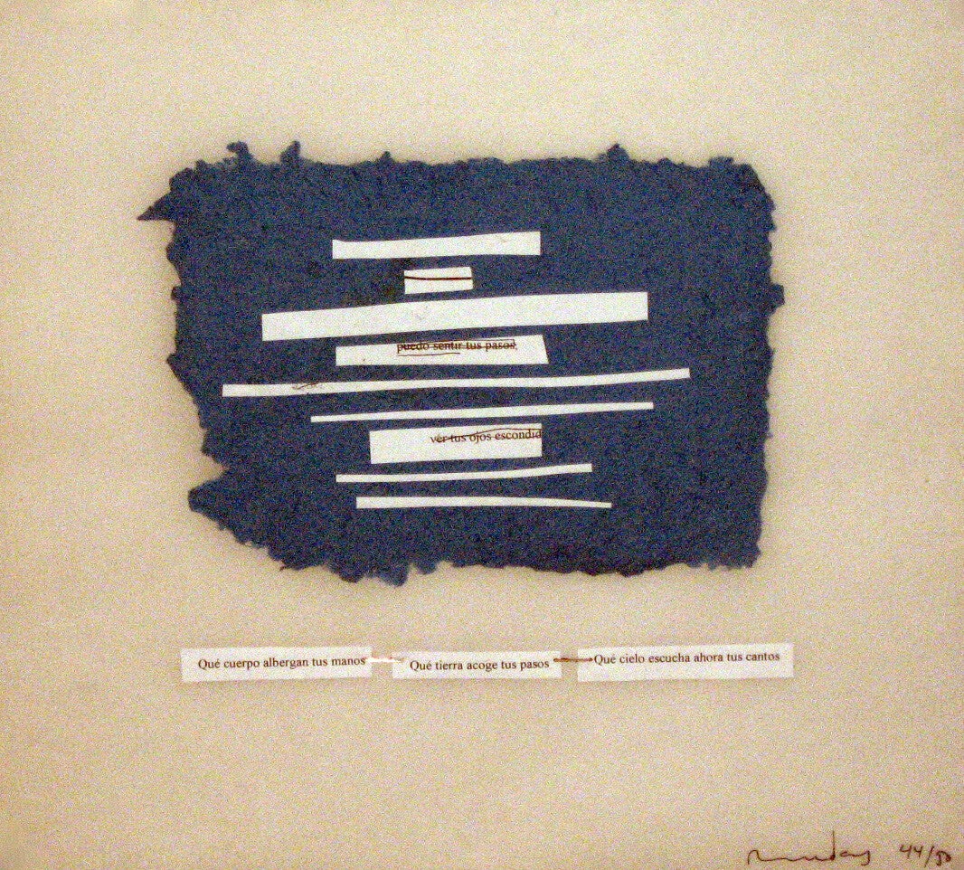 Los restos de textos no visibilizados o desechados sirven de material para la serie de collages o libro imposible Mudas 50/50.