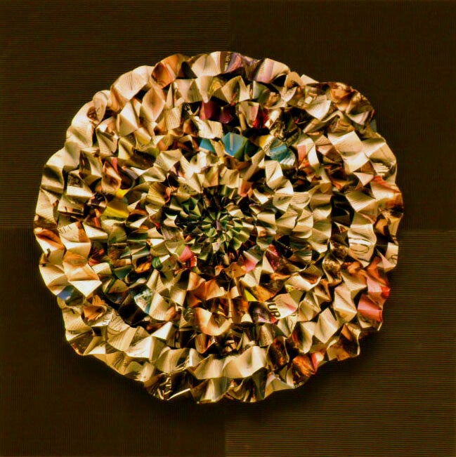 Collage tridimensional realizado a partir del trenzado de papeles procedentes de revistas recicladas en una búsqueda por llevar la palabra escrita al espacio y al movimiento. Pertenece a un conjunto de piezas escultóricas realizadas en papel que se mostraron en Oña en la exposición Palabra Papel o Tijera (2013).